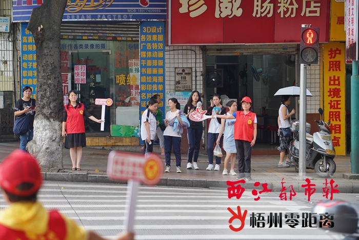 7月4日,在中山路梧州市工人醫(yī)院阜民病區(qū)對出路口,萬秀區(qū)的黨員干部志愿者正開展交通勸導,引導市民安全文明出行。