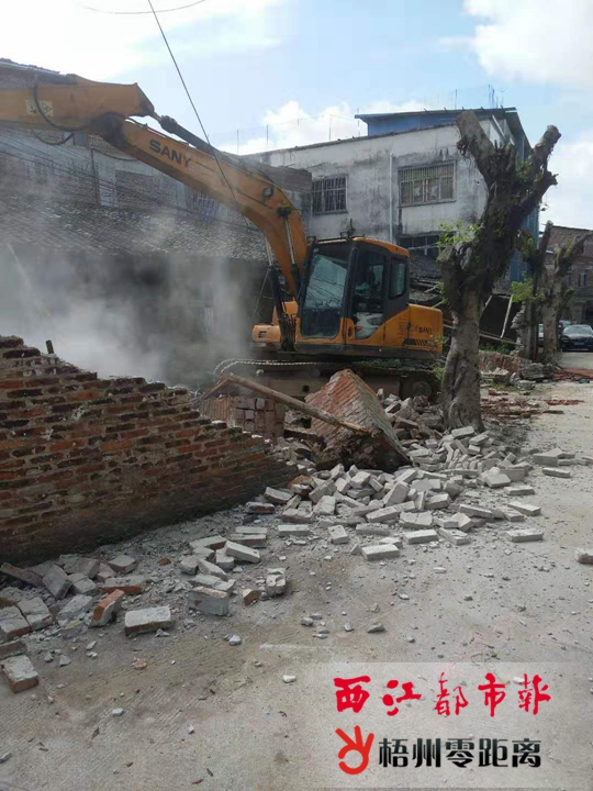 7月4日,在長洲區龍新村七組,施工人員利用大型機械拆除危房。據悉,拆除危房后,龍新村村委和村民小組計劃投資20萬元打造小游園,供村民休閑娛樂,預計今年10月份可投用。 記者 紀榮蘭 通訊員 潘錦松 攝影報道