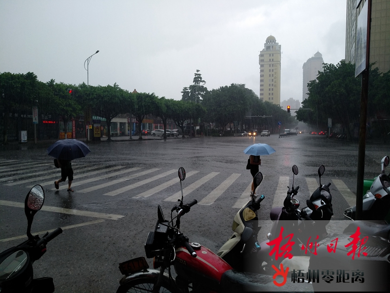 7月9日上午,在西堤一路,人們在大雨中過馬路。