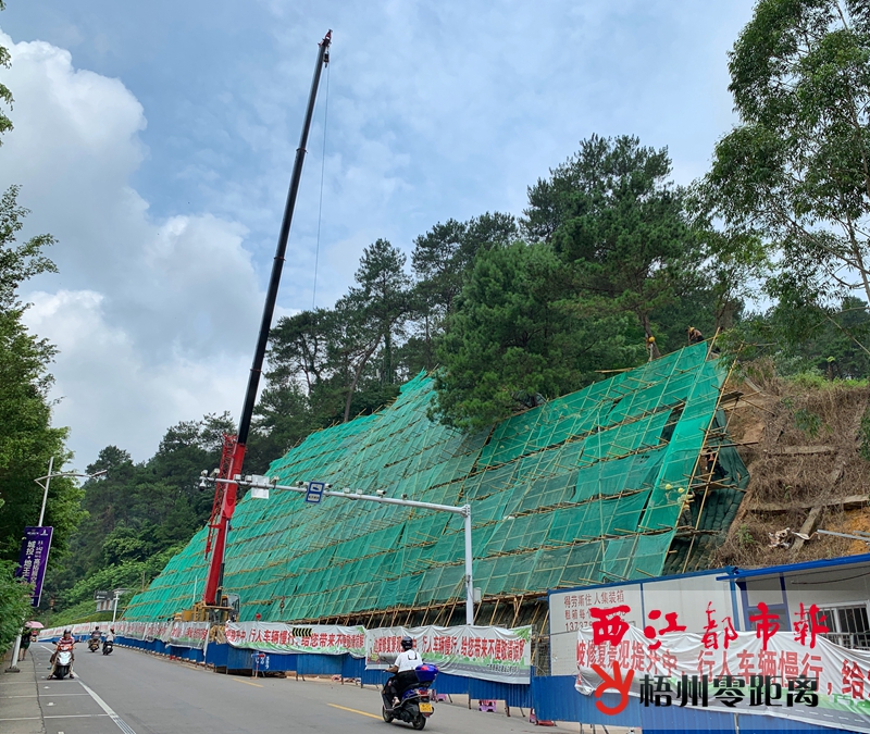 7月6日,施工人員在白云山景區(qū)大門對面的山體邊坡固定土壤。 據(jù)了解,此處工程施工屬于白云路邊坡修復景觀提升工程,目前土壤固定施工進入收尾階段,下一步施工方將種植綠化植物。整個工程預計今年9月完工。 記者 陳凡 攝 通訊員 黎海平