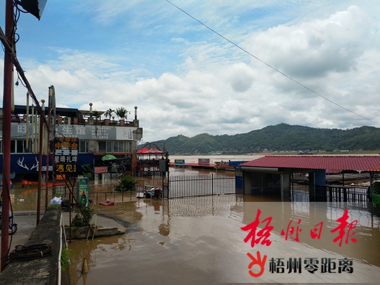 梧州零距離網-梧州日報訊(記者 柳雙 通訊員 余林)受上游持續降雨及來水影響,我市主要江河出現了較明顯的漲水過程,預計西江梧州水文站將于7月12日上午出現超警戒水位(18.5米)1.3米左右的洪水,沿江區域有關單位及社會公眾應加強防范,及時避險。7月10日上午,記者在河西老碼頭看到,洪水已漫上碼頭平臺,碼頭平臺上的店鋪一樓已被淹。