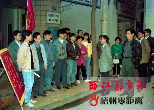 1994年梧州遭遇特大洪水,次年年初,梧州日報社從各采編部門中抽調(diào)業(yè)務(wù)骨干和年輕記者,組成一支前線采訪隊,前往受災(zāi)嚴(yán)重的鄉(xiāng)鎮(zhèn)采訪災(zāi)后重建情況。圖為采訪隊出發(fā)前,市領(lǐng)導(dǎo)專門到報社為記者們鼓勁。(孟亞西 攝)
