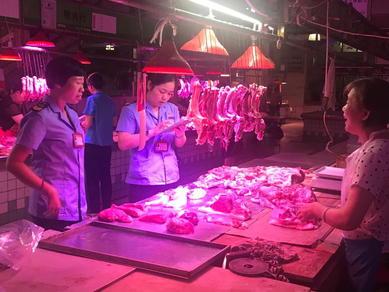 7月9日,梧州市食品藥品檢驗所、萬秀區市場監督管理局組成聯合檢查組,來到河東片區南中市場檢查豬牛肉、海鮮、蔬果等攤檔。