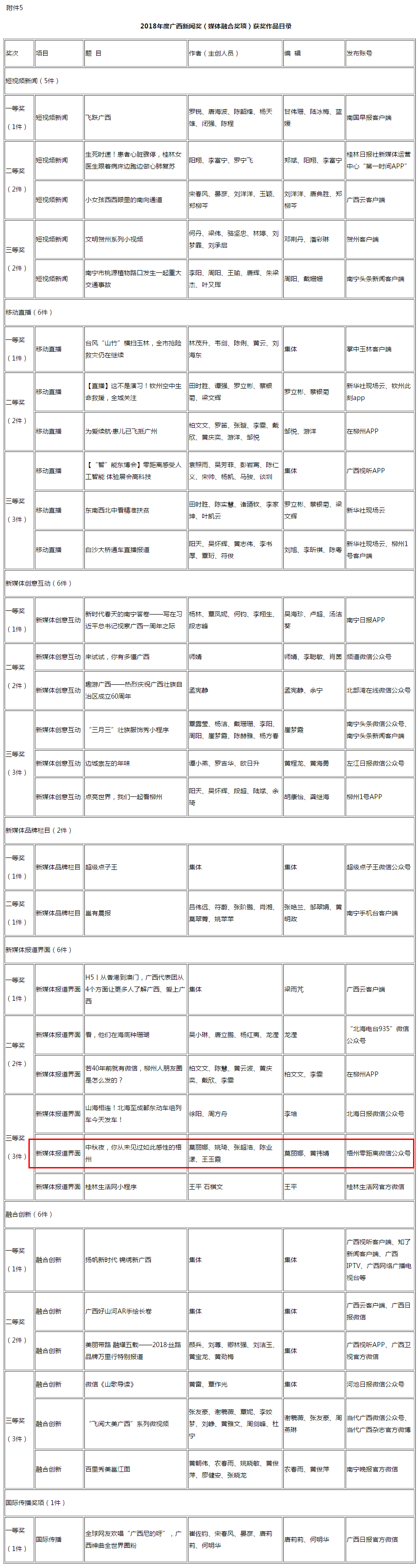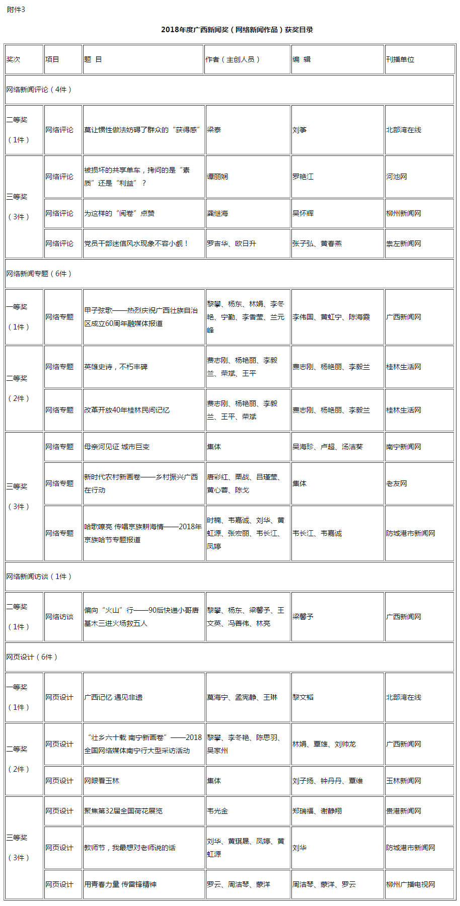 2018年度廣西新聞獎評選結果公示 根據《關于開展2018年度廣西新聞獎評選活動的通知》規定,現在廣西新聞網公示2018年度廣西新聞獎評選結果,歡迎社會各界監督、評議。公示日期為2019年7月15日中午12時至7月22日中午12時,共5個工作日。在此期間,社會各界可通過電話、傳真、信函或電子郵件等方式發表意見,對舉報我們將按有關規定進行核查。 電話:0771-5587396,傳真:0771-5587392 電子郵箱:gxjzxh@126.com 地址:南寧市民族大道112號 郵編:530022 附件: