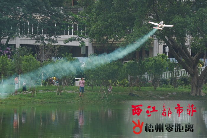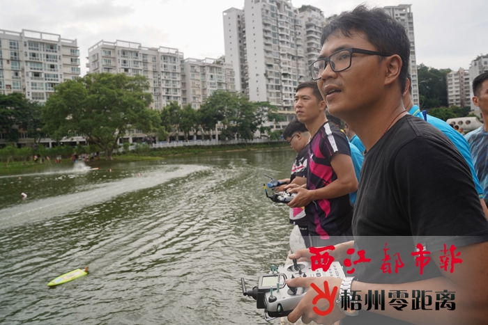 比賽尚未開始,梧州市航空航海車輛模型運動協會的成員就出動了數架航空模型“造勢”,在潘塘公園上空展示空中旋轉、垂直飛行等高難度動作。旋即,不少市民被航空表演所吸引,聚集在湖邊等待開賽。