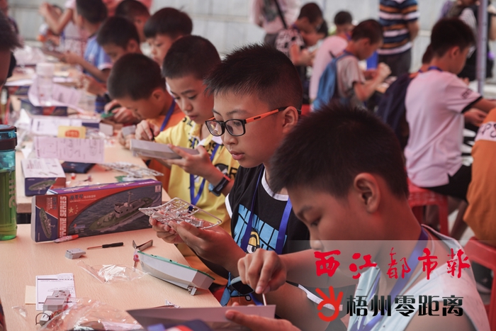 在少兒分會場中,小選手現場組裝魚雷快艇模型。