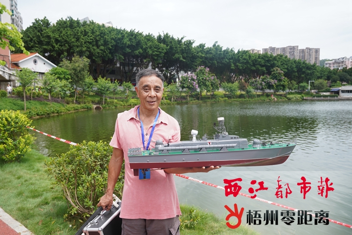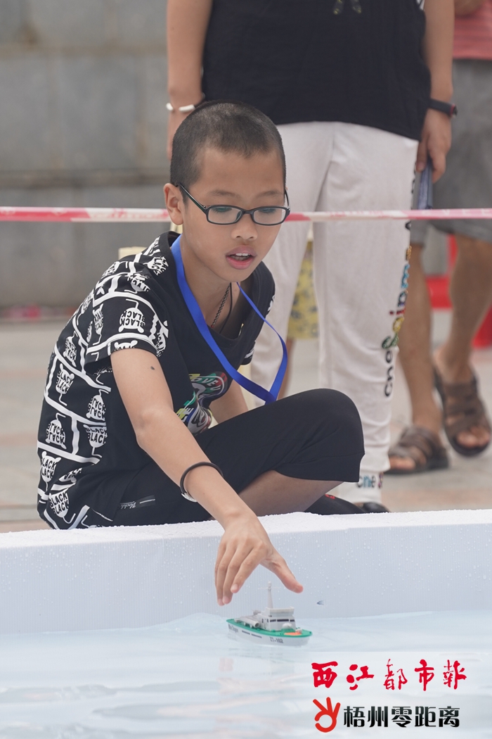 小選手將自己拼裝好的魚雷快艇模型放下水試航。 西江都市報記者 鄧發浩/文 楊揚/圖 |