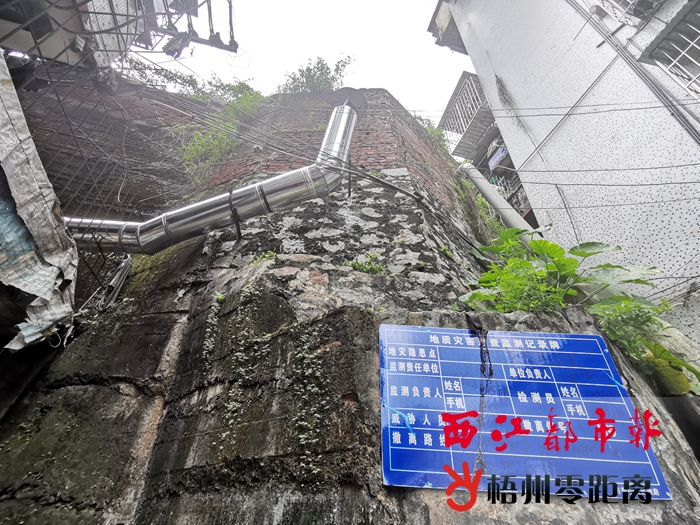 梧州零距離網(wǎng)-西江都市報(bào)訊(記者 陳雨燕 實(shí)習(xí)生 莫惟珺)一家餐飲店的排煙管道竟然“釘”在地災(zāi)隱患點(diǎn)上,日前,家住工廠二路上沖6至9號住宅樓的群眾向本報(bào)反映這個(gè)問題,稱周邊居民對此表示擔(dān)心。 7月15日,記者來到群眾反映的住宅樓了解情況,只見該樓地層一家餐飲店的后窗外,一條圓形的排煙管道伸了出來。管道跨過居民出入通道,延伸至住宅樓后方的一堵石墻上,并用鐵架進(jìn)行固定。而在石墻上,懸掛著一塊地質(zhì)災(zāi)害巡查監(jiān)測記錄牌,提示此處是一處地災(zāi)隱患點(diǎn)。此外,記者還發(fā)現(xiàn),石墻上方的紅磚圍墻存在肉眼可見的裂縫。