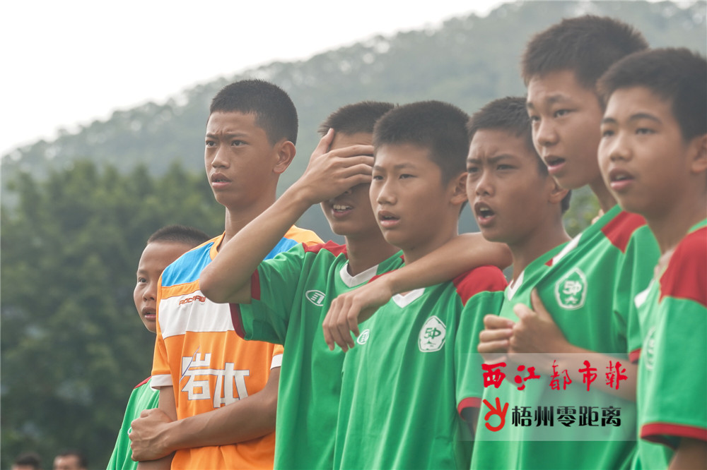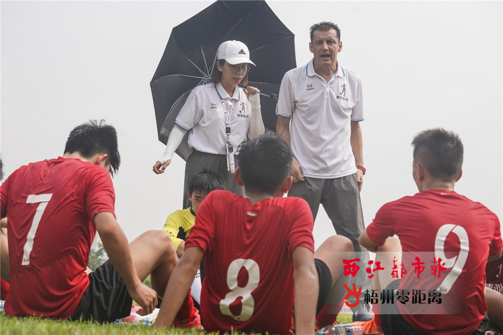 中場休息時間,外籍教練對隊員戰術進行部署。當前,聘用外籍教練來提高青訓水平已經成為一種趨勢。 高年齡組別比賽水平相對專業,低年齡組別的賽事則充滿趣味。本次比賽中年齡最小的隊員不足7歲,許多孩子都是狂熱的球迷,有的進球后還會模仿球星進球后的慶祝動作,讓人忍俊不禁。梧州近期天氣炎熱,比賽期間的氣溫都在30℃以上,家長們用心良苦,“狠心”地看著孩子在烈日下競逐,即使孩子跑步跌倒、丟球流淚也“袖手旁觀”,任由足球磨煉孩子的意志。