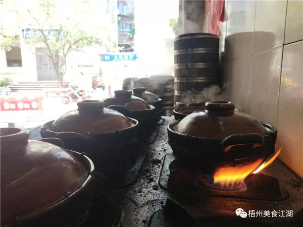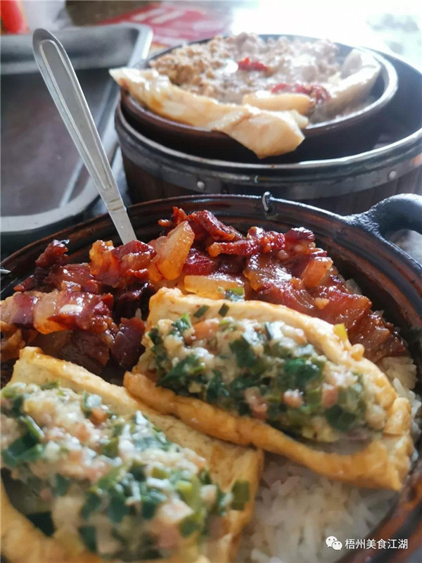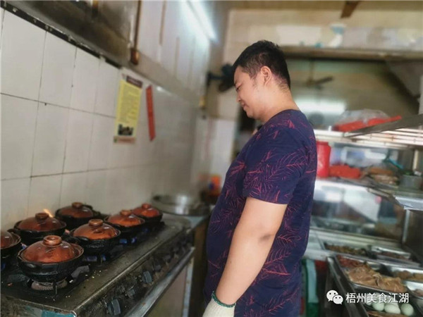 老徐的兒子肥仔 肥仔是個頭腦靈活的人,來梧州不到三年,白話說得跟本地人一樣流利,而且他烹飪起來肢體也十分靈活。站在灶臺前,肥仔面臨“前有煲仔飯,后有客人點餐,左有蒸籠飯”的局面,只有做到一心三用,才可以Hold住(掌控)全場。 煲仔飯和蒸籠飯大同小異,都是米飯熟了以后加入配菜,繼續烹煮即可,只是煲仔飯更需要控制火候。肥仔最忙的時候需要同時烹煮五六份煲仔飯,哪個煲該放米放水,哪個煲該放配菜淋油,他都要熟記于心。