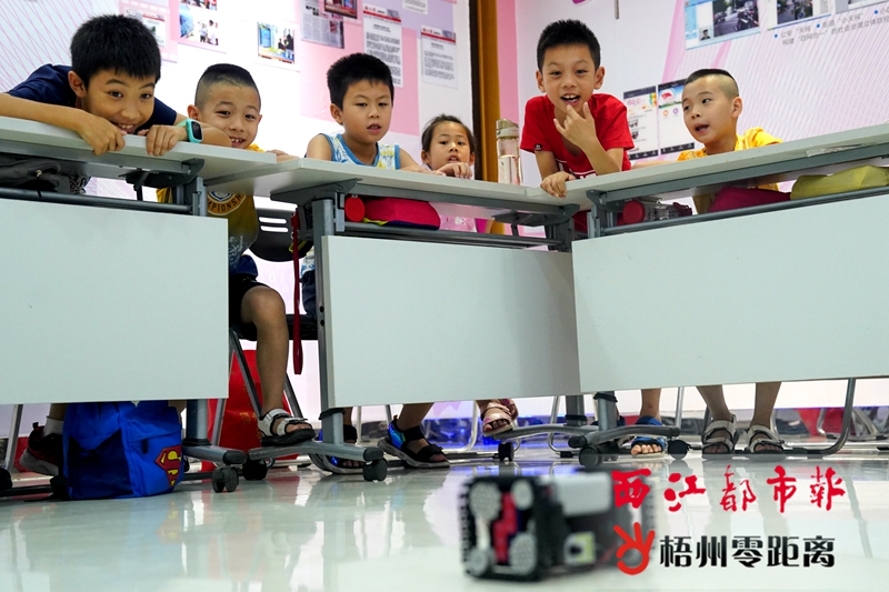 梧州零距離-西江都市報訊(記者 姚藍婷 通訊員 鄧培生)為了讓孩子們度過一個安全而有意義的暑假,長洲區大塘街道豐業社區整合多方資源開展“暑假成長營”公益課堂。7月30日,豐業社區攜手長洲區關工委開展了“暑假成長營”公益課堂最后一課——機器人科普教學,讓孩子在家門口感受科技魅力。 授課老師給孩子們講解如何設計程序和操作等機器人知識后,向孩子們展示了聲控的航母機器人、能自由搏擊的搏擊機器人,以及履帶機器人、追線機器人等。孩子們分批對機器人進行實際操作,利用擊球機器人模擬了一場保齡球比賽。“機器人可真厲害,我也想要一個屬于自己的機器人。”7歲的孩子陸喜楹說。