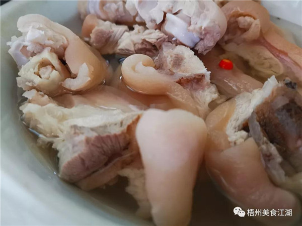 白云豬手 梧州很多粉店都有豬手,很多都是濃妝艷抹,視覺沖擊強,但做白蓮花狀的白云豬手卻較為少見。這種豬手特點是酸中帶甜、肥而不膩、骨肉易離、皮脆肉滑,令人食而不厭。