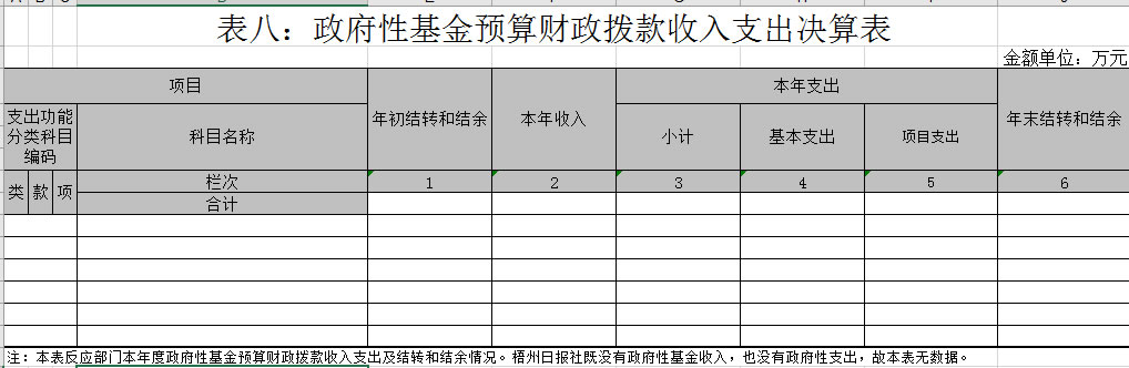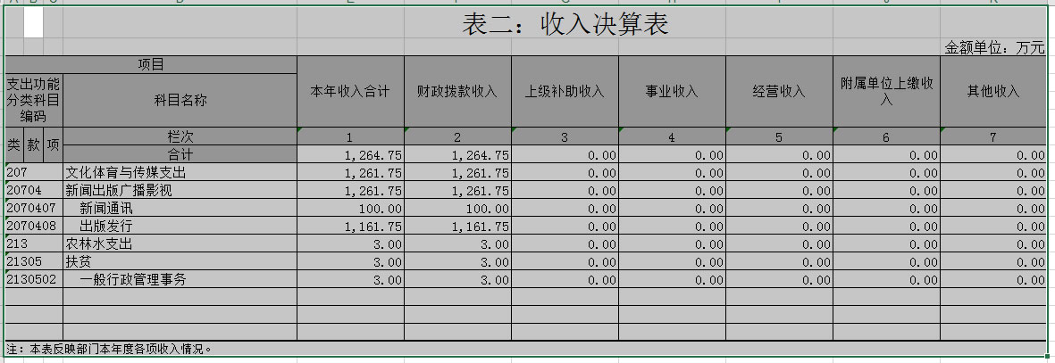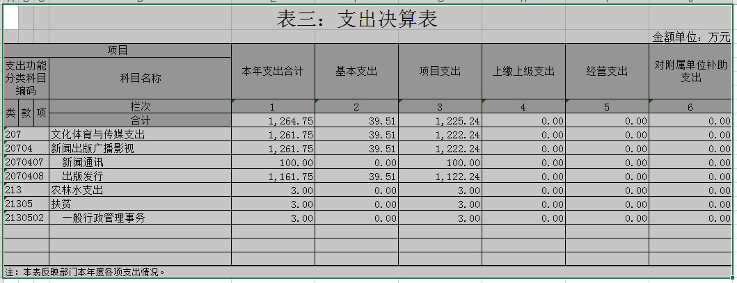 第四部分:專業名詞解釋 (一)財政撥款收入:指本級財政部門當年撥付的資金。 (二)事業收入:指事業單位開展專業業務活動及輔助活動所取得的收入。 (三)經營收入:指事業單位在專業業務活動及其輔助活動之外開展非獨立核算經營活動取得的收入。 (四)其他收入:指除上述“財政撥款收入”“事業收入”“經營收入”等以外的收入。 (五)用事業基金彌補收支差額指事業單位在當年的“財政撥款收入”“事業收入”“經營收入”“其他收入”不足以安排當年支出的情況下,使用以前年度積累的事業基金(事業單位當年收支相抵后按國家規定提取、用于彌補以后年度收支差額的基金)彌補本年度收支缺口的資金。 (六)年初結轉和結余:指以前年度尚未完成、結轉到本年按有關規定繼續使用的資金。 (七)結余分配:指事業單位按規定提取的職工福利基金、事業基金和繳納的所得稅,以及建設單位按規定應交回的基本建設竣工項目結余資金。 (八)年末結轉和結余:指本年度或以前年度預算安排、因客觀條件發生變化無法按原計劃實施,需要延遲到以后年度按有關規定繼續使用的資金。 (九)基本支出:指為保障機構正常運轉、完成日常工作任務而發生的人員支出和公用支出。 (十)項目支出:指在基本支出之外為完成特定行政任務和事業發展目標所發生的支出。 (十一)經營支出:指事業單位在專業業務活動及其輔助活動之外開展非獨立核算經營活動發生的支出。 (十二)“三公”經費:納入本級財政預決算管理的“三公”經費,是指各部門用財政撥款安排的因公出國(境)費、公務用車購置及運行費和公務接待費。其中,因公出國(境)費反映單位公務出國(境)的國際旅費、國外城市間交通費、住宿費、伙食費、培訓費、公雜費等支出;公務用車購置及運行費反映單位公務用車車輛購置支出(含車輛購置稅)及租用費、燃料費、維修費、過路過橋費、保險費、安全獎勵費用等支出;公務接待費反映單位按規定開支的各類公務接待(含外賓接待)支出。 (十三)機關運行經費:為保障行政單位(含參照公務員法管理的事業單位)運行用于購買貨物和服務的各項資金,包括辦公及印刷費、郵電費、差旅費、會議費、福利費、日常維修費、專用材料及一般設備購置費、辦公用房水電費、辦公用房取暖費、辦公用房物業管理費、公務用車運行維護費以及其他費用。 (十四)印刷項目:是我單位將新聞信息等內容經制版、施墨、加壓等工序,批量復制,把經審核批準的印刷版,通過印刷機械及專用油墨轉印到承印物的過程。 (十五)網站維護項目:我單位主營梧州零距離網站,通過投入大量人力物力定期或不定期地更新網站內容,保持網站正常運營,完善網站建設,提高網站整體質量,不斷地吸引更多的瀏覽者,增加訪問量,擴大影響力。 (十六)專項業務項目:主要指稿費支出,即作者向報社雜志社投稿被采用后需要對其支付的報酬。