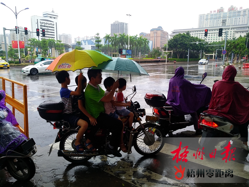 8月1日,在新興三路柳州銀行附近十字路口,一名大人駕駛摩托車搭乘著四個小孩子。