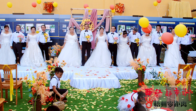 8月4日17時30分,在藤縣太平鎮(zhèn)一家酒店的戶外草坪上,音樂聲響起,一對對身著婚紗和禮服的男女緩緩步入婚禮現(xiàn)場。這場集體婚禮的主角有些特別,是一對對攜手半生的夫妻。婚禮上,年過半百的他們莊重地完成每一個婚禮步驟,交換戒指、深情對望、擁抱……