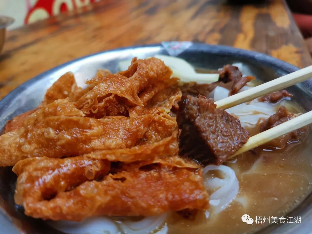 腐竹叉燒粉 食客“都不易”:可能是老板在粉里加進了肉汁的緣故,粉湯很夠味。叉燒味道一般,但牛腩比較軟,嚼起來不費勁。粉比較厚,個人喜歡吃薄一點的粉,但總體來說味道還過得去。 營業時間:早上6時30分至下午4時 地址:梧州市新興二路125號10號樓地層104號鋪(京梧市場路口直入約100米左邊)