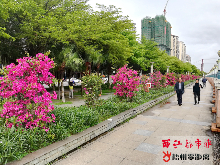 2019 年,市園林部門對西堤公園進行彩化,新種、改種水紅寶巾花和多色寶巾花,公園內的寶巾花長廊成為休閑之地。記者 吳艷虹 攝 21世紀起,梧州市區發展重心西移,拓展紅嶺新區。2000年后建立的西堤公園、玫瑰湖公園則推動了河西片區、紅嶺片區向宜居城區發展。 在西堤路沿江地帶建立的西堤公園,始建于2004年,全長4.39公里,定位為帶狀公園,主要以梧州市花——寶巾花為展示“賣點”。回憶起當年的西堤公園,據“60后”市民覃先生講述,早些年的西堤公園時花、綠植很少,景色單一,也沒有雕塑和健身器材,那時他偶爾會在早上到西堤公園的竹園打太極。后來,西堤公園不斷增綠添彩,增加了竹園、紫荊園等。如今,他每回打完太極,都會打開收音機,坐在公園長椅上眺望江水,“環境好了,總想在這里多待一會兒”。