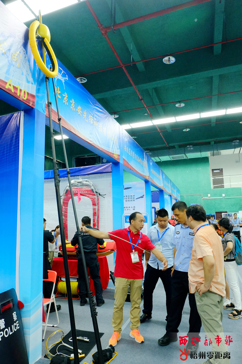 參展廠商推介可以快速伸縮的救生桿,該救生桿桿首可以掛載入套索、救生圈等各種救生裝置。記者 何鎏 攝 其中,來自河南省戈泰裝備有限公司生產研發的降溫馬甲、降溫遮陽傘和降溫毛巾,專門圍繞交巡警戶外高溫天氣的工作特性制造,可以為在高溫環境下執勤的民警降溫解暑,吸引不少警務人員試用體驗。而由公安部第一研究所與北京中天鋒安全防護技術有限公司研制的手持式毛發毒品痕量快速分析儀,因方便攜帶且能實現常見毒品的現場實時快速檢測,也吸引了不少專業觀眾的關注。當天開展1個小時內,已有公安廳機關、四個地市與相關裝備生產企業達成了訂購意向,并現場舉行了裝備訂購集體簽約儀式。 為了讓市民能近距離了解、體驗警用裝備,本次展示會將于8月7日8時至18時免費向公眾開放。屆時,大批高科技警用裝備將面向市民集中亮相。市民憑本人身份證在場館門口領取參觀證,即可進入會場參觀。