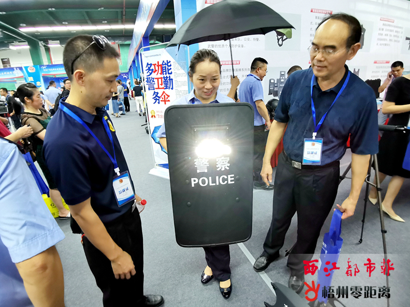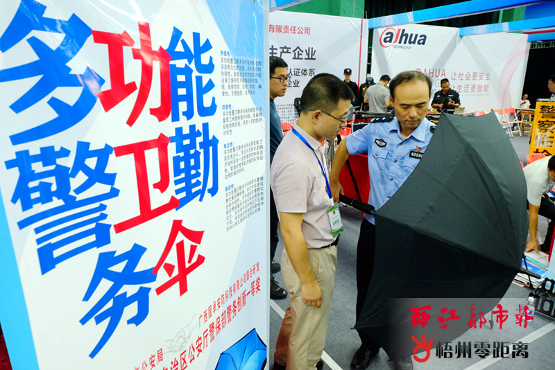 一位民警嘗試操作可以加載電擊和催淚裝置的新型防割警衛勤務傘。記者 何鎏 攝 據悉,為做好新中國成立70周年大慶、第16屆東博會等大型活動安保裝備保障工作,充分發揮新型警用裝備在各項安保活動中的重要作用,公安廳決定由梧州市公安局承辦本屆裝備展,以推動全市公安警務保障工作創新發展。 此次展會為期兩日,共有53家來自全國各地的警用裝備生產廠商參展,全部為公安部認證生產企業。展品按警用裝備功能分為防護、安檢、無人設備、反恐、器械、交通、刑事、單警、通信、車輛等10大類進行展示,基本匯集了目前國內警用裝備研發的最新產品,預計吸引專業觀眾超2000人。 此次參加展會的展品以安檢、防護、防暴、反恐、無人機反制、新型單警裝備等目前市場上科技含量高、性能較優的最新產品為主。8月6日的展會現場,集作戰及防護一體的警用多功能裝備包、人像識別創新的實戰應用平臺等多項演示項目,吸引了眾多觀眾駐足觀看、咨詢。