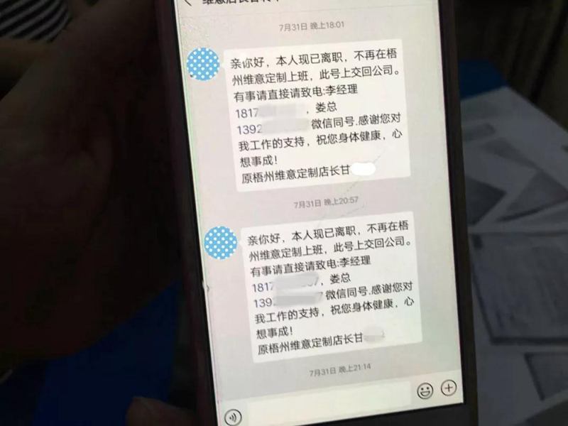 梧州維意定制門店工作人員與消費(fèi)者的聊天記錄截圖 “梧州維意定制門店應(yīng)該是出了一些問題的,此前還能看到他們店里有近十名員工,但是在關(guān)門前幾天卻沒看見員工上班。聽部分員工說,他們已被拖欠了三個月的工資,所以員工都辭職不干了。”一名女性受害消費(fèi)者說,當(dāng)時的店長曾特意發(fā)來信息說自己離職了,有事聯(lián)系其他同事。 而對于梧州維意定制門店拖欠員工工資一事,記者也從市內(nèi)一些裝飾裝修行業(yè)經(jīng)營者中了解到類似的說法。
