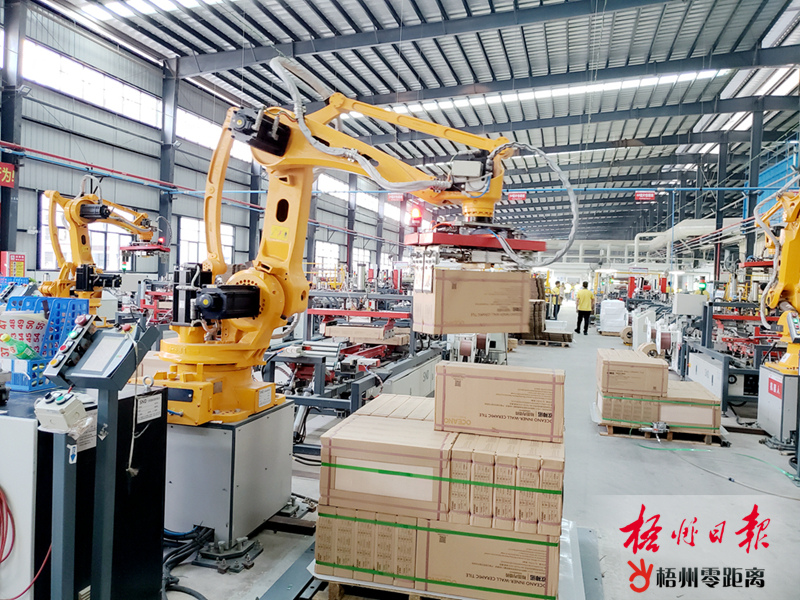 8月3日上午, 在廣西歐神諾陶瓷有限公司生產車間,機器人正在開展生產作業。