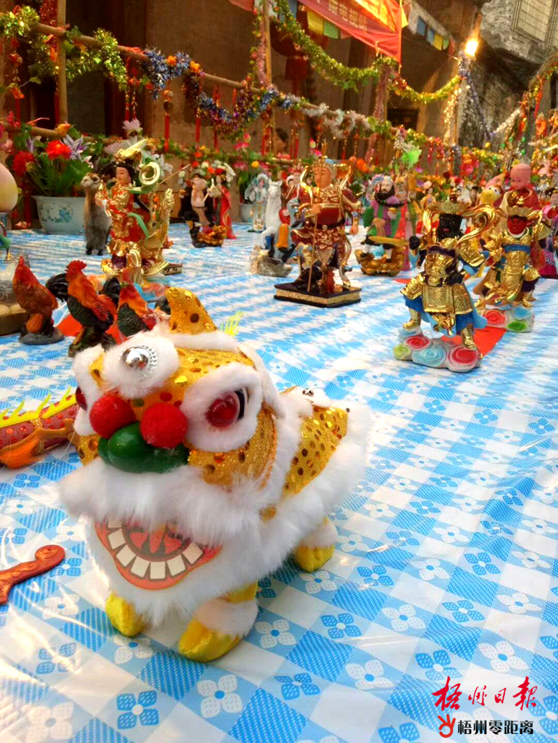供桌上擺放著經過婦女們加工的各種傳說人物的手工藝品。霍金鈴 攝