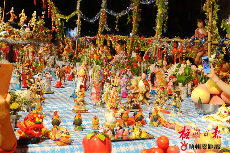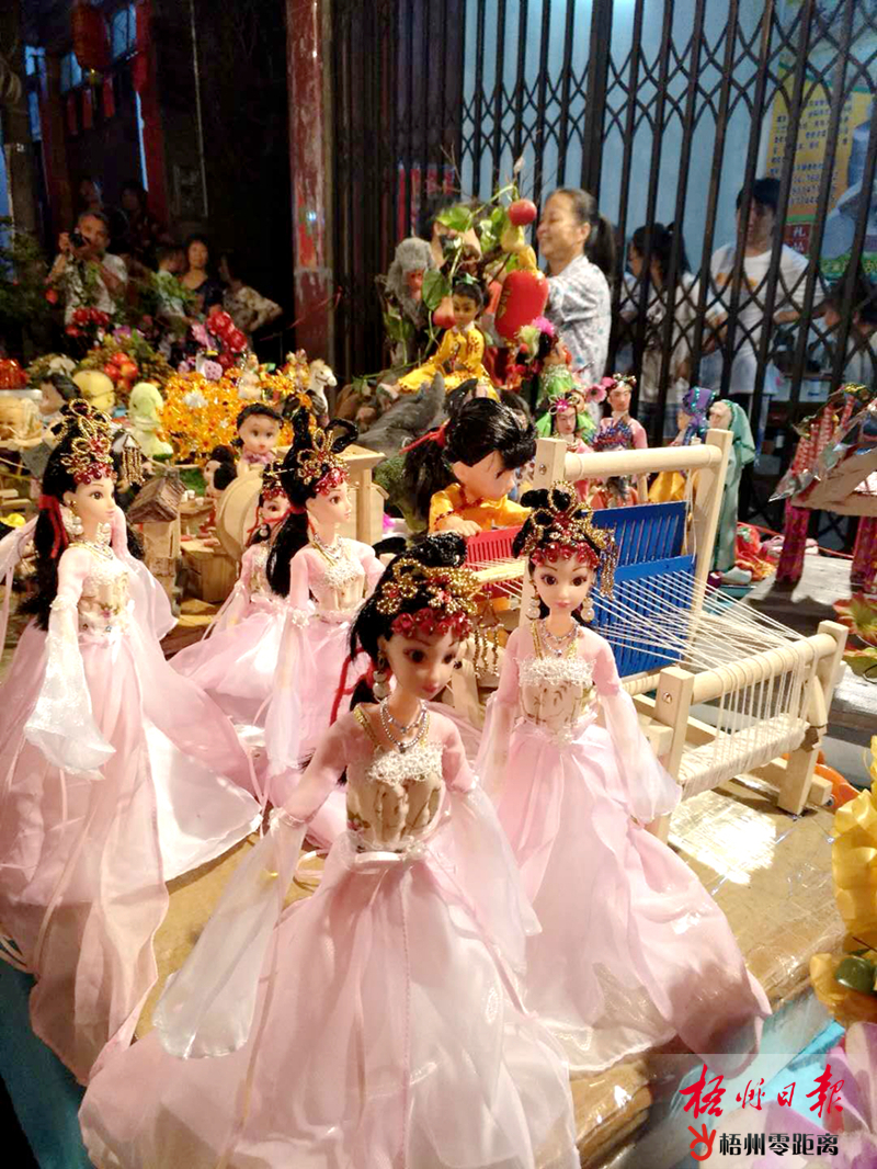 供桌上的手工藝品栩栩如生,非常精致。黃自芬 攝 乞巧節活動通常在農歷的七月初六入夜開始,天亮即散。今年農歷七月初六是公歷8月6日。當晚,筆者分別在藤縣太平鎮正東街、德勝街、上元街、文武二帝廟門口看到,上述地點擺有供桌,供桌上擺放著用紙、布、竹篾、藤麻、樹枝等制作成天庭、龍宮、凌霄殿、南天門、鵲橋、牛郎織女等手工藝品,把七仙女游花園、牛郎織女相會、天姬送子等故事場景表現出來,還有用珠子串綴成動物、人物,用花生、袋裝餅干或利是串聯成寶塔,用彩紙裁剪縫制出仙女衣裙等。還有添加了食用色素純手工描繪制作的印彩糍粑,造型各異、精致美觀、琳瑯滿目,讓人大開眼界,吸引了大量群眾參與活動。