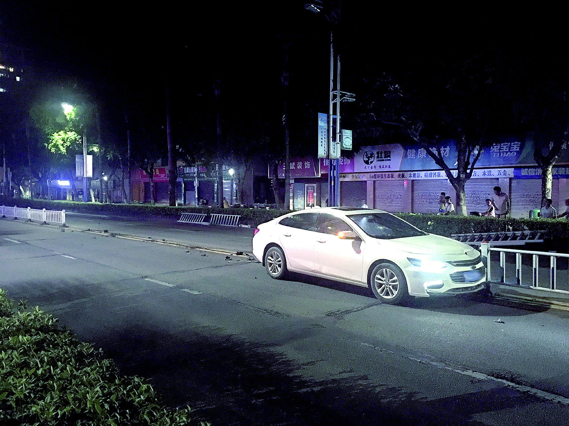 8月8日晚,在新興一路,一輛白色小車撞上機動車道的中央防護欄。(報料市民劉小姐供圖)
