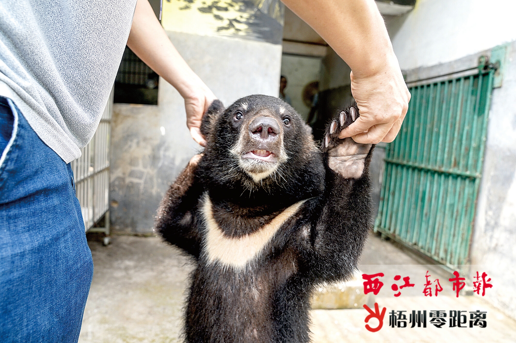 梧州零距離網(wǎng)-西江都市報(bào)記者吳艷虹 實(shí)習(xí)生 孫思源 通訊員 張艷萍 在太和公園的一間籠舍里,黑熊幼仔俊俊雙腳直立,與獸醫(yī)師手拉手,開(kāi)心地玩著轉(zhuǎn)圈圈,而比它晚出生幾分鐘的美美則坐在一旁呆萌地看著。這有趣的一幕惹得籠舍外的游客也忍俊不禁。 黑熊幼仔俊俊、美美是一對(duì)雙胞胎兄妹,出生于今年1月,它們是梧州市首例成功人工飼養(yǎng)繁殖的黑熊幼仔。此前,黑熊幼仔出生后存活不超過(guò)10天??】『兔烂赖慕】党砷L(zhǎng),見(jiàn)證著梧州在人工飼養(yǎng)繁殖黑熊方面邁出了新的一步。