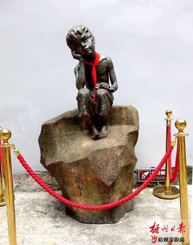 大門旁邊的崗樓,隨時監視四周。 白公館最初是一戶富人的別墅,后被國民黨特務機關占為監獄。白公館的大門并不寬闊,呈“凸”字形,門頭上寫著“香山別墅”四個大字。跨入大門口,是一個約五六十平方米的露天庭院。眼光越過庭院,正面是一排兩層高的樓房,一層需從右邊拾級而上,上下兩層各有3個牢房。庭院的圍墻上架設有電網,顯得陰森恐怖。庭院的左側種有一棵石榴樹,據說是一名叫許曉軒的烈士到監獄外做苦工時,把幼樹帶回來種下的,如今根深葉茂,預示革命事業永遠常青。庭院的右側設有一座石雕像,那正是侄孫要見的“小蘿卜頭”。老師上課時,曾告訴同學們,白公館內有“小蘿卜頭”的頭像,侄孫異常興奮地說:“叔公,你看‘小蘿卜頭’!”,他的目光充滿了對小英雄的無限敬意。