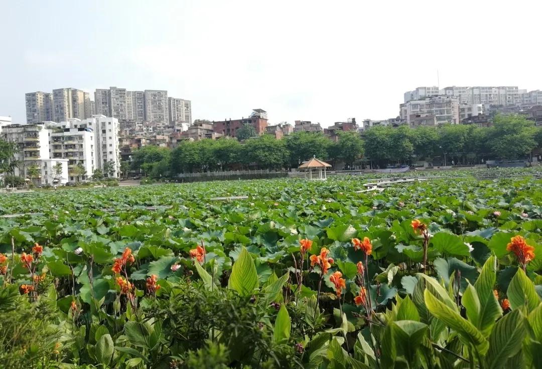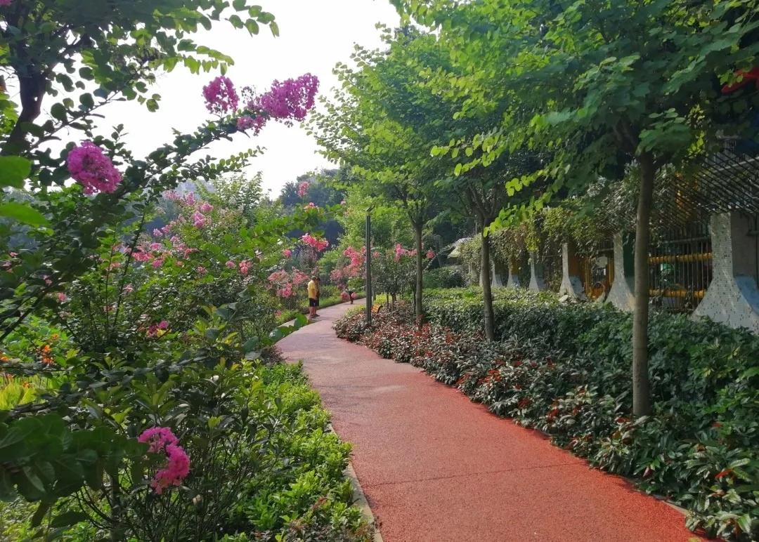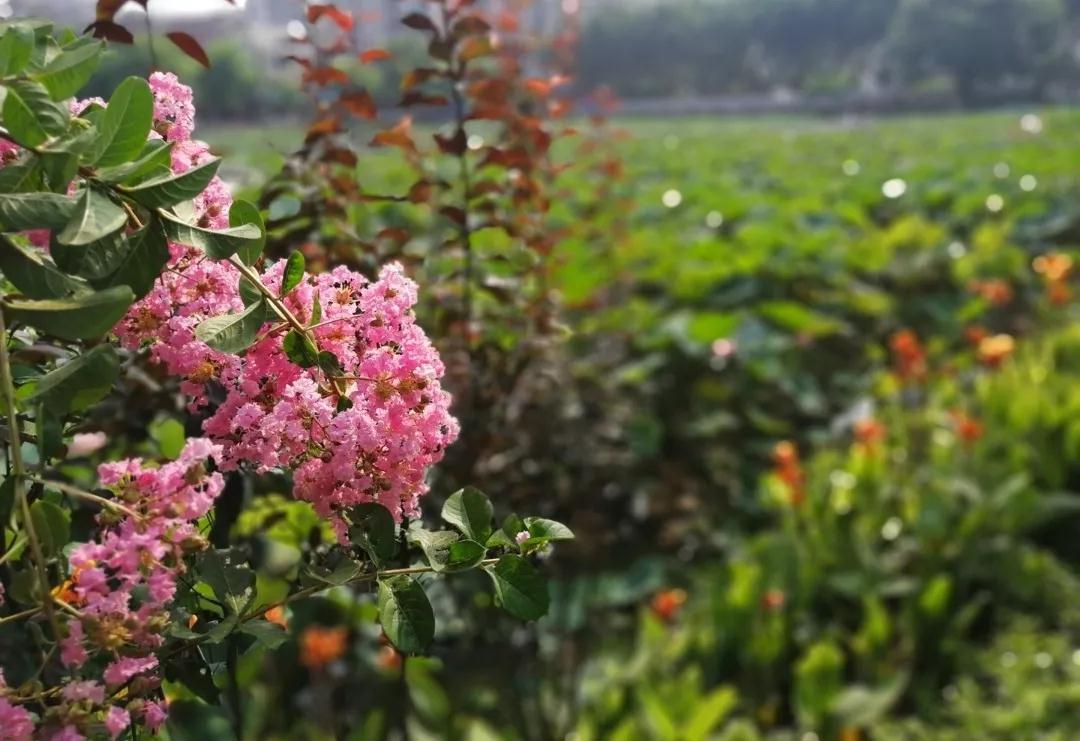 荷塘邊的綠道蔥蘢怡人,五顏六色的花兒爭奇斗艷。