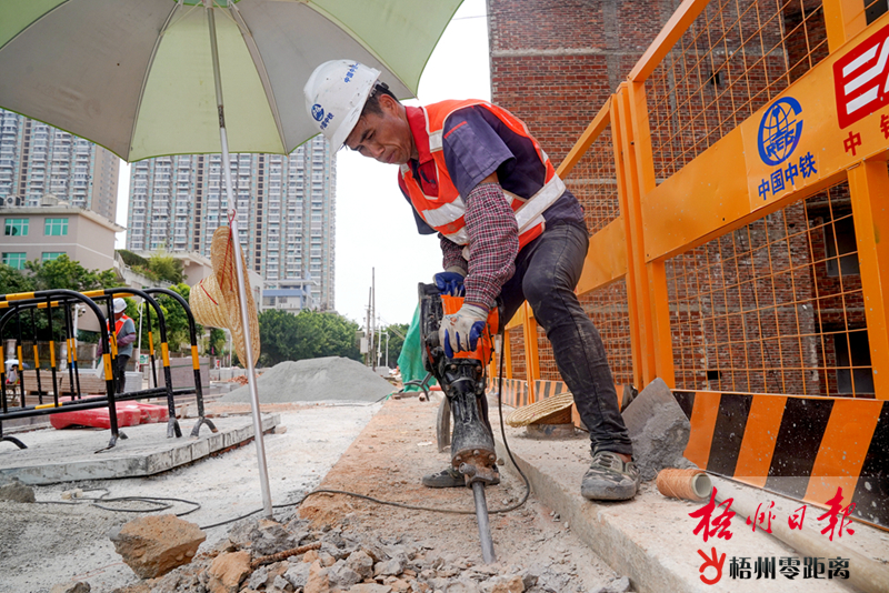 8月16日,施工人員在長洲區新湖一路施工工地破拆舊地磚。