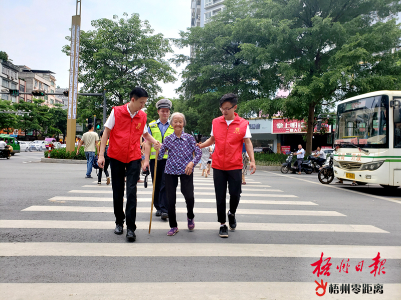 8月16日,藤縣公安交警和志愿者一起護送老婆婆安全過馬路。