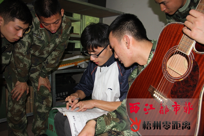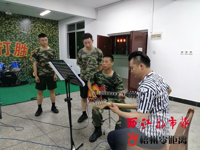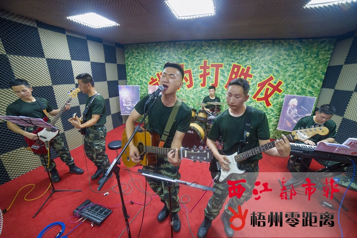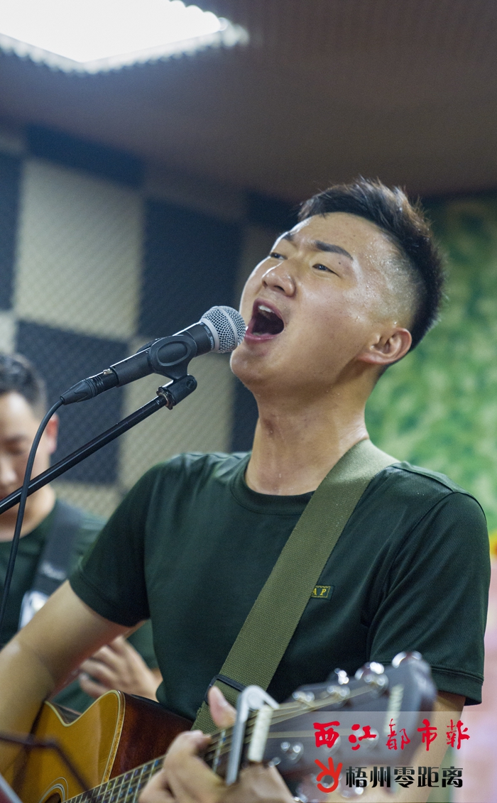采寫:記者 陳雨燕 實習生 曾溪涵 莫惟珺 攝影:記者 陳 凡(除署名外) 烈日當空,空氣悶熱,“超燃”的地表擋不住奮進的步伐,在武警廣西總隊梧州支隊的訓練場上,戰士們的訓練正在如火如荼進行。就在訓練間隙,一陣悠揚的吉他聲傳來,隨之而來的還有樸實真摯的歌聲:“我和我的祖國,一刻也不能分割……” 這是武警廣西總隊梧州支隊的“強軍小樂隊”為獻禮新中國70華誕而制作的快閃視頻。在視頻里,他們歌唱祖國山河,歌唱赤子之情。視頻外,他們則是衛國戍邊的忠誠衛士。 這支由戰士自發組織的“草根”樂隊被網友們稱為“地表最強樂隊”,隊里有6名成員,分別是隊長兼鼓手劉天琦,主唱兼吉他手郭裕豪,電吉他手張淵恒、李望貴,貝司手江懷鵬,鍵盤手毛威。這群小伙子來自天南地北,卻同樣愛好著音樂。