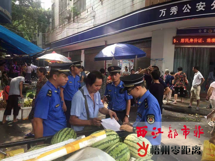 8月19日,萬秀區城管執法大隊對萬秀區體育里一流動擺賣西瓜的攤檔作暫扣處理。 據了解,體育里周邊有不少流動擺賣水果、菜類的攤販占道經營,當天,執法大隊聯合城東街道辦事處對體育里進行市容環境整治,對占道經營、跨門檻經營商鋪發出《責令整改通知書》28份。