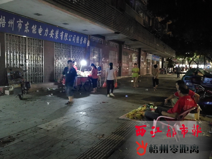 梧州零距離網-西江都市報訊(記者 吳艷虹)新興一路是梧州市區的嚴管街之一,經過長時間整治,其占道經營現象已大為改善。但是,近日有網友反映:位于新興一路的文瀾市場每天有流動攤販在18時至20時上街擺檔,與城管隊員“打游擊”。城管部門表示,在城管隊員交接班的間隙,確實存在攤檔“沖線經營”現象,城管部門將嚴查這種行為。 8月19日19時許,記者來到文瀾市場走訪,發現此處的人行道已有三個流動攤點。其中,擺在附近一家電力安裝公司經營部前的水果檔占據路面面積最大,果販的三輪車上還點起了照明燈。水果檔對面,有人擺地攤賣香蕉,鋪在地面的塑料布占據了盲道。另一個流動攤點則是售賣毛巾的,占道面積較小。此外,不遠處還有一名果販推著自行車在賣水果。