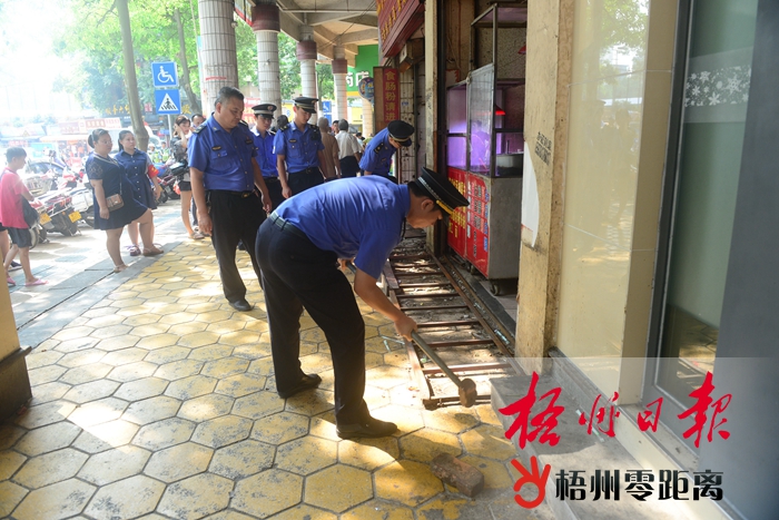 8月22日,在阜民路,執(zhí)法人員正在拆除占道的臺階。 目前我市正在大力開展“四城聯(lián)創(chuàng)”活動。連日來,萬秀區(qū)開展專項整治行動,組織城區(qū)相關(guān)職能部門,對阜民路、大東下路等路段的占道經(jīng)營、臨時搭蓋進(jìn)行專項整治,創(chuàng)造良好的街道環(huán)境。