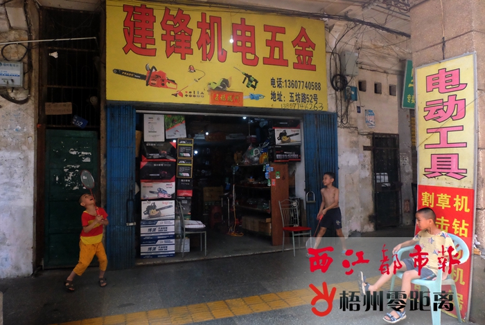 8月22日,在梧州市五坊路一家五金店前,相鄰幾家店面的孩子們在騎樓下進行羽毛球賽。兩人打球一人當裁判,輪流上場,笑聲彌漫在古老的騎樓間。
