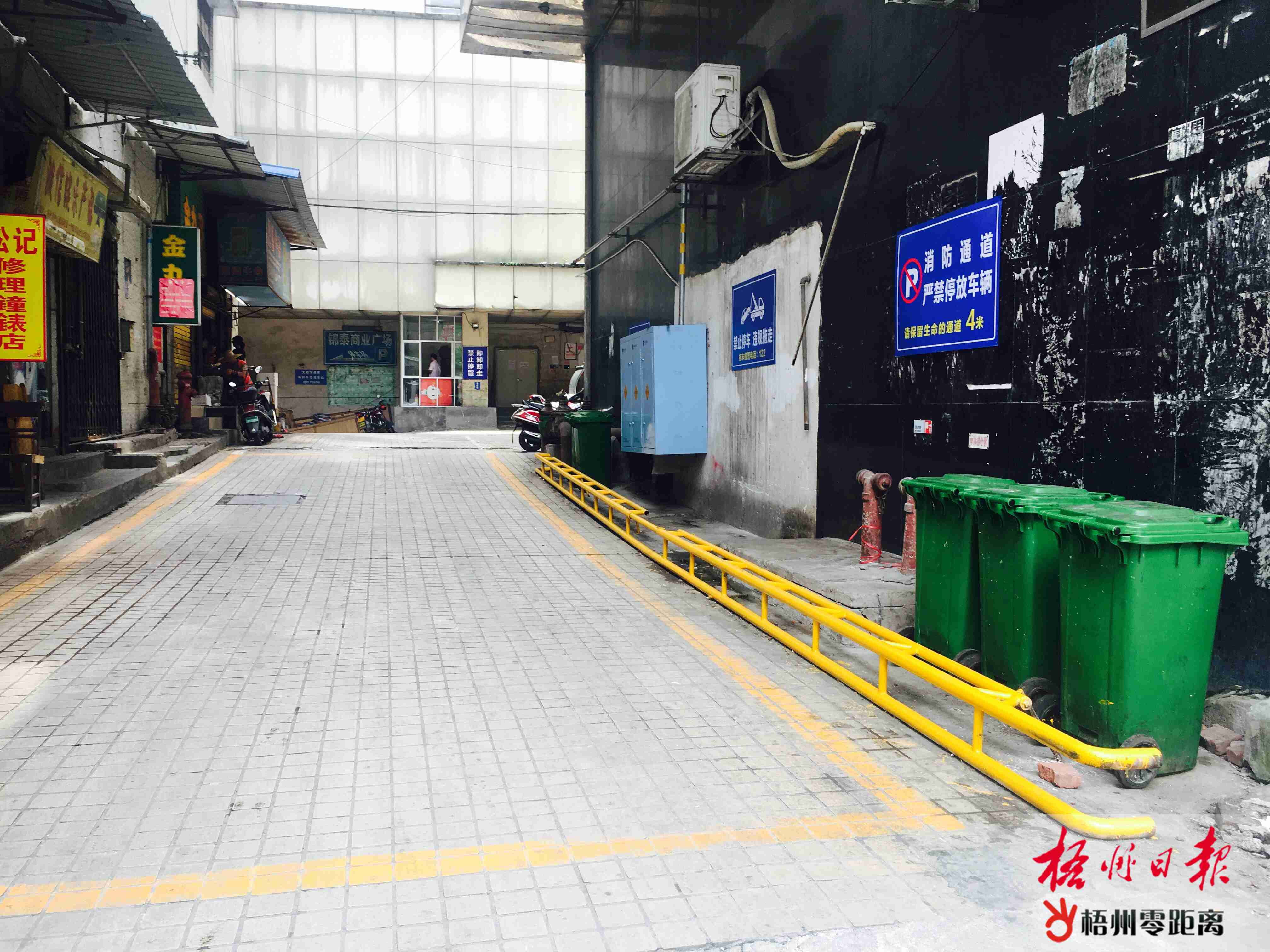 萬秀區(qū)中山路人行道上,垃圾桶擺放整齊,墻上明顯位置張貼有禁停標(biāo)志。盧海燕 攝