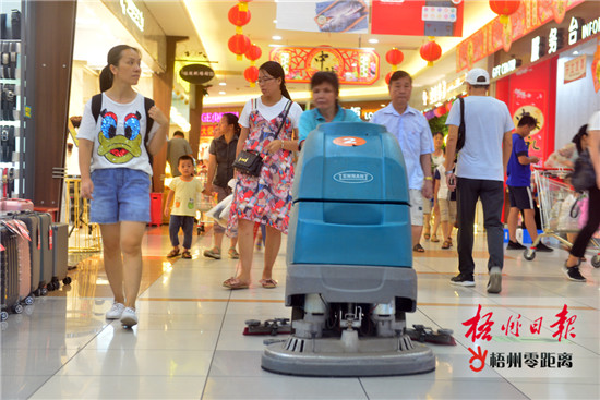 梧州零距離-梧州日報記者 曾燕 超市、商場作為市民日常購物的主要便民服務(wù)場所,是創(chuàng)建全國文明城市的重要窗口,理應(yīng)擔(dān)負(fù)起宣傳公益、倡導(dǎo)文明的社會責(zé)任。8月24日,依照文明城市創(chuàng)建相關(guān)標(biāo)準(zhǔn),記者對梧州市區(qū)部分超市、商場的內(nèi)外部環(huán)境衛(wèi)生、營業(yè)員文明服務(wù)和行業(yè)誠信建設(shè)、服務(wù)承諾公示,以及消防安全設(shè)施建設(shè)管理、創(chuàng)建宣傳等情況進行走訪,發(fā)現(xiàn)各場所在環(huán)境衛(wèi)生、消防設(shè)施、投訴機制等方面有很大提升,但文明創(chuàng)建氛圍不夠濃厚、廁所衛(wèi)生整潔度低等問題仍有待改善。 內(nèi)外通道暢通消防設(shè)施齊備 24日,記者先后走訪沃爾瑪超市、旺城廣場、大潤發(fā)超市、太陽廣場、梅西百貨及其超市等發(fā)現(xiàn),大部分商場和超市室內(nèi)環(huán)境比較衛(wèi)生,購物通道、消防通道、安全出口等保持暢通狀態(tài),且在商場、通道內(nèi)均設(shè)置有滅火器等消防設(shè)施,墻上也張貼有消防安全常識宣傳海報,安全出口指示標(biāo)志醒目。