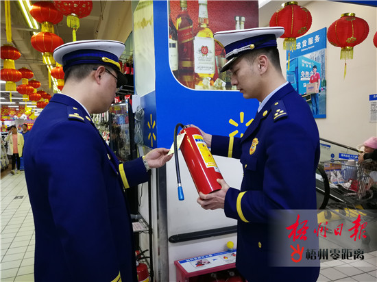 市消防救援支隊工作人員對沃爾瑪超市內(nèi)的消防設(shè)施進行檢查。(資料圖片)曾韻 攝 在商場和超市服務(wù)臺內(nèi),均放置有投訴意見處理本,各商品柜臺、商場內(nèi)餐館也放置有顧客投訴建議記事本等。同時,各大商場、超市內(nèi)物品擺放有序、購物環(huán)境較好,未發(fā)現(xiàn)出售過期、變質(zhì)、偽劣食品。其中,部分超市內(nèi)散裝食品加蓋了防塵防蠅設(shè)施,保證了散裝食品衛(wèi)生。