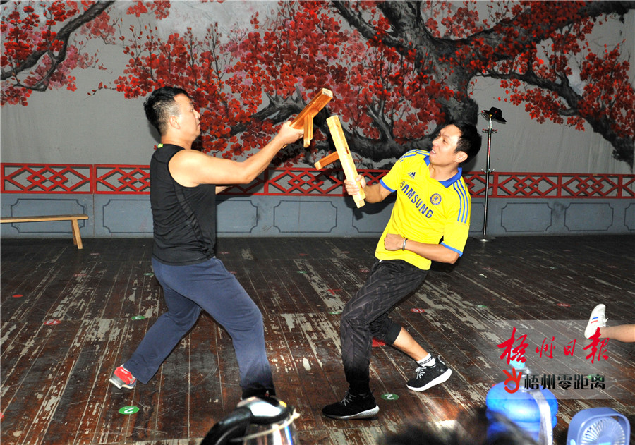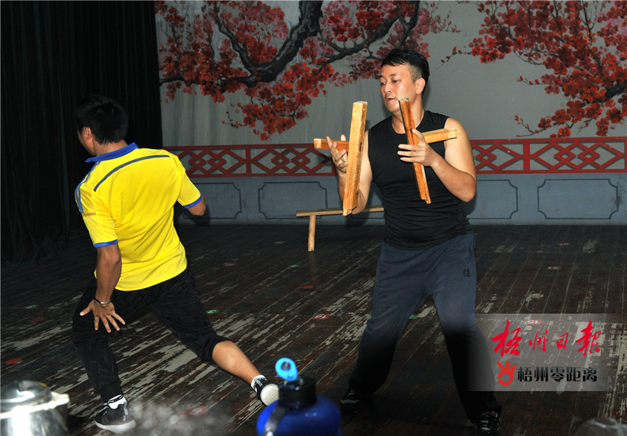 演員在練習拐棍開打。 李杰峰和陳耀歡兩人是師兄弟,1995年起在武生這一行當堅持至今,他們都是梁向光的師弟。對于他們倆來說,武生的艱苦就如同吃飯喝水一樣平常,日子久了,便不覺得苦了。在陳耀歡的記憶中,印象最深刻的一次排練是因為不小心把手折斷了。李杰峰清楚地記得當時陳耀歡并不知道自己的手斷了,是同學告訴他,他才慢慢意識到痛感,幸好那時候還年輕,恢復得快,對表演并沒有造成影響。這事沒有阻擋陳耀歡對粵劇、對武生事業的熱情。工作之后,他們才發現,在學校學習到的東西是遠遠不夠的,直至今天,經驗豐富的他們仍在不斷的學習當中,同時利用業余時間鍛煉身體,以最好的狀態面對每一場演出和每一次排練。