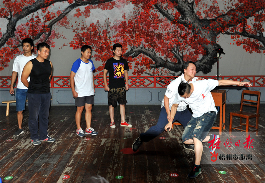 粵劇團的演員正在排練。 排練的間隙,滿頭大汗的梁向光一邊大口喝水,一邊和記者說起為何從事這一行業。幼年時,跟隨父母去看大戲便喜歡上了戲劇,被粵劇中那些生動的形象深深地吸引,于是,活潑好動的梁向光在初中班主任的提議下,報名參加了粵劇藝術考試。經過激烈的競爭,最后只有二十個學生留下,梁向光便是其中的一個。畢業后,梁向光和同班同學一起回到梧州粵劇團,但是不少人只堅持了幾年便先后離開劇團,唯有他留了下來并一直堅持至今。 梁向光坦言,武生這一行當不好當,打斗的戲份是必不可少的,受傷對他來說早已習以為常。在近一個多月的排練中,梁向光的手腳有不少受傷的地方。梁向光曾經因為在學校練習打筋斗時不小心導致手脫臼,后來,他的手一不小心就會習慣性脫臼,盡管現在排練時他都盡量小心,但還是避免不了。這次的新劇《抉擇》,梁向光的打斗戲多。8月初排練時,因為天氣炎熱導致他在排練時中暑暈倒,在同事們的幫助下才逐漸恢復過來。隨著年齡增大,他面對的困難也不斷增多,但是他并沒有退縮。只要劇團有需要,梁向光都積極參與。他說,因為熱愛,熱愛粵劇,熱愛武生這個角色。