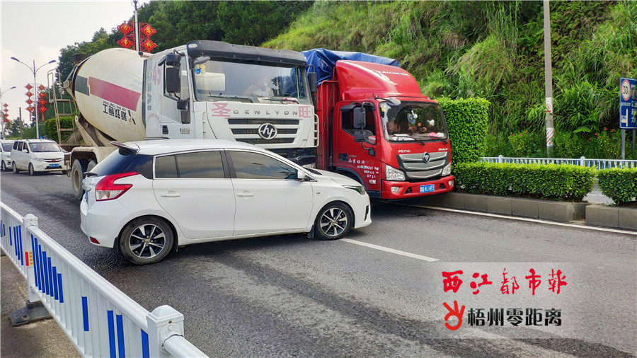 8月28日上午8時許,梧州往龍圩方向發生一起三車相撞事故,涉事的小車、貨車和攪拌車把道路封死,造成了超過20分鐘的交通堵塞,不少前往梧州南站及龍圩區的市民、司機出行受阻。通訊員 韓寶丞 攝