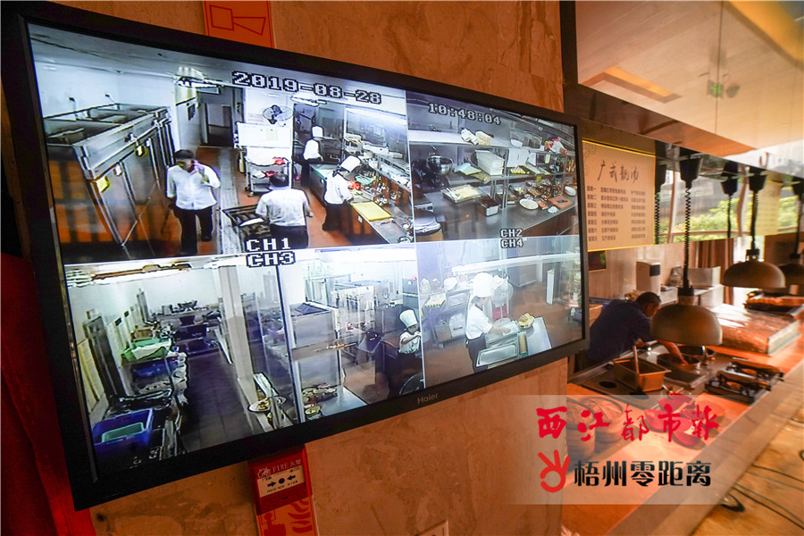 金龍城市酒店在正門處放置無障礙通道提示牌,示意有需要人士可從酒店后方停車場的專用道路進入。 酒店的顯著位置公示了工商營業執照、有效的健康合格證明、衛生許可證、衛生信譽度、衛生檢測報告及從業人員健康合格證明等,做到亮證經營。 同時,兩家酒店實現了明廚亮灶,通過視頻廚房建設,將菜品的切配烹飪、生冷食類食品加工環節直觀地展示給消費者,引導公眾參與食品安全建設。