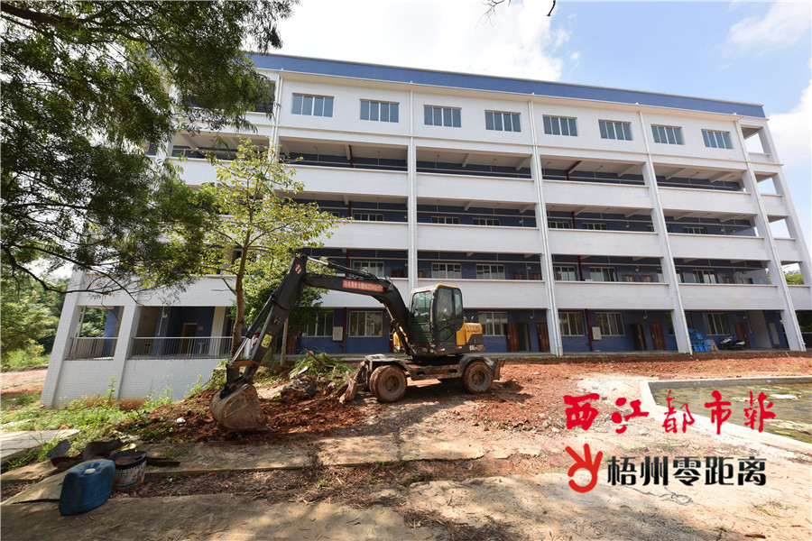 8月28日,在梧州六中高中樓前,工程機械正在進行樓前空地的地面平整硬化。當日,記者在六中方面獲悉,校內新建成的高中樓已投入使用,樓內如電子白板一體機、課桌椅等教學配套設施正陸續安裝,此外,該校的學生食堂、住宿樓、生活用水設施等也已配備齊全。從今年秋季學期起,該校恢復高中部招生,今年招收了三個班共180人。 (梧州零距離-西江都市報記者 何鎏/攝)