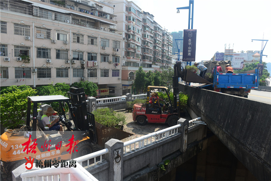 8月28日,在河?xùn)|防洪堤桂江段,施工車輛正在搬移堤面上的綠化盆栽。據(jù)了解,我市對河?xùn)|防洪堤龍母廟至鴛江大橋東橋頭段實施提升改造工程,計劃對堤面、護(hù)欄、綠化等進(jìn)行改造。近日,施工單位已開始重新噴涂堤面和步梯的欄桿,綠化部門抓緊搬移盆栽,為堤面改造做好前期工作。梧州零距離-梧州日報記者 李鴻榮 攝