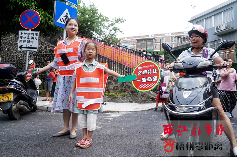 9月2日,鳳翔小學開學典禮上,老師們合唱《我和我的祖國》,一年級新生揮動紅旗應和節奏。記者 陳凡 攝 開學第一課,做新時代文明人 記者了解到,開學第一天,梧州市內的其他學校也以嶄新的面貌,與同學們一起開啟新學期新征程。 當天,梧州市新興二路小學邀請執勤交警,帶領學生、家長一起,在上午上學時段于校門口開展文明交通勸導活動。該校一年級1908班的學生蘇楚淇與媽媽李玥,穿著鮮艷的紅馬甲,站在機動車道旁,利用引導牌指引送學生上學的車輛快停快走。當人群準備過馬路時,她們就截停過往車輛,讓大家能安全通行。有了這股文明勸導力量,校門口前早高峰的車流變得更為有序。