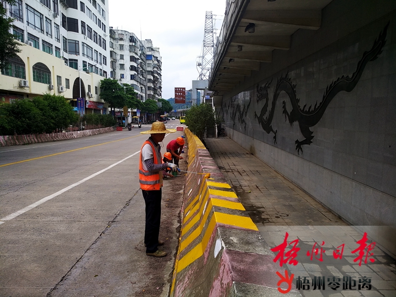 9月1日,在龍母廟景區門前道路,工人在旱橋兩側的安全護欄粉刷反光漆。
