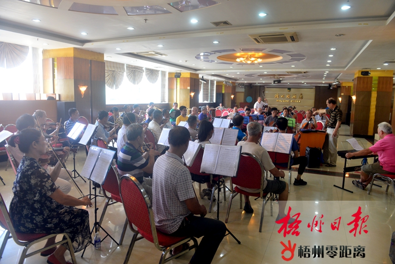 日前,一支由60多人組成的業余管弦樂團在梧州大酒店進行《我的祖國》排練。